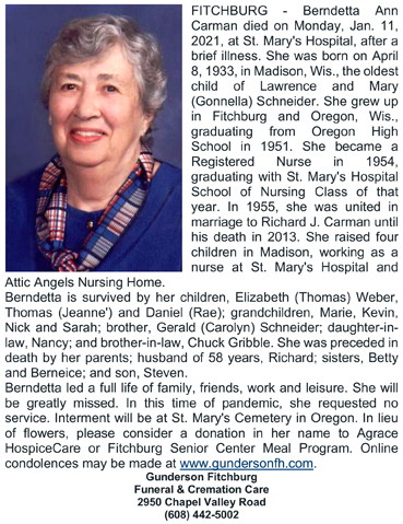 Carman, Berndetta Ann (nee Schneider) Obit Cemetery