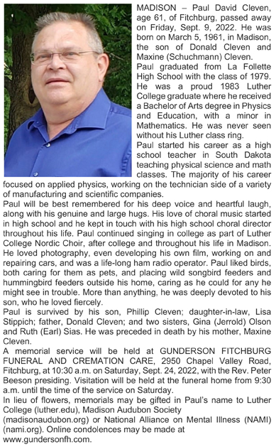 Cleven, Paul David Obit Cemetery