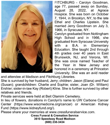 Goodman, Carolyn (nee Lipstein) Obit Cemetery