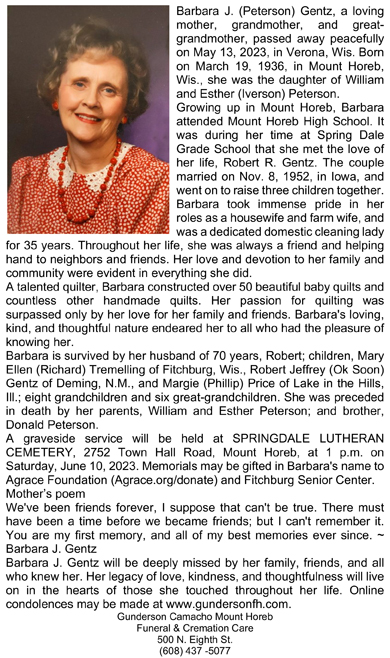 Gentz, Barbara Jean (nee Peterson) Obit Cemetery
