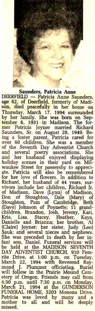 Saunders, Patricia Anne (nee Joyner) Obit