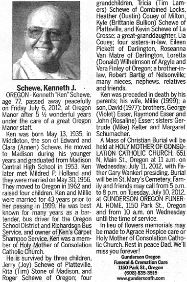 Schewe, Kenneth J. “Ken” Obit Cemetery