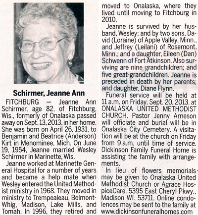 Schirmer, Jeanne Ann (nee Kirt) Obit Cemetery
