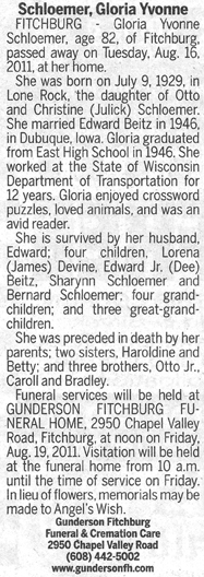 Schloemer, Gloria Yvonne Obit