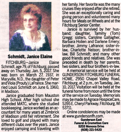 Schmidt, Janice Elaine (nee LaFrance) Obit