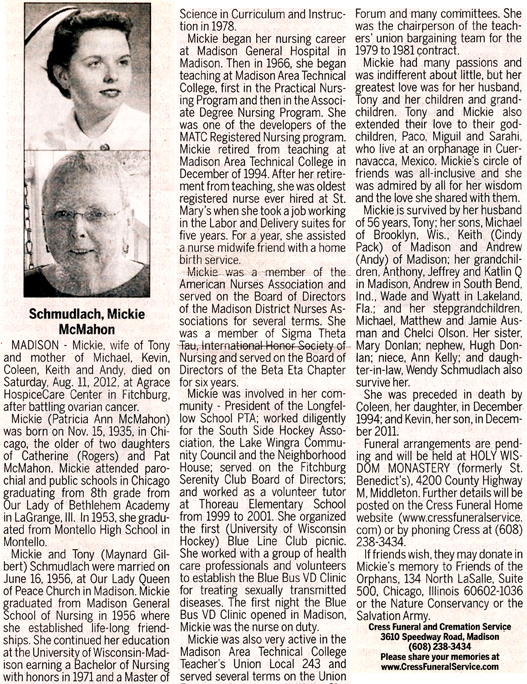 Schmudlach, Patricia Ann “Mickie” (nee McMahon) Obit Cemetery