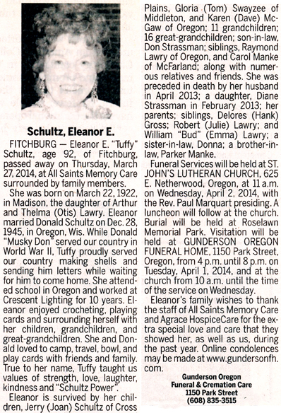 Schultz, Eleanor E. “Tuffy” (nee Lawry) Obit Cemetery