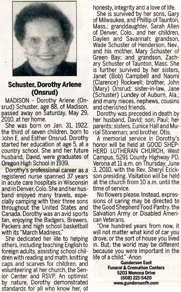 Schuster, Dorothy Arlene (nee Onsrud) Obit