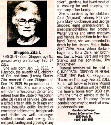 Shippee, Zita I. (nee Starks) Obit