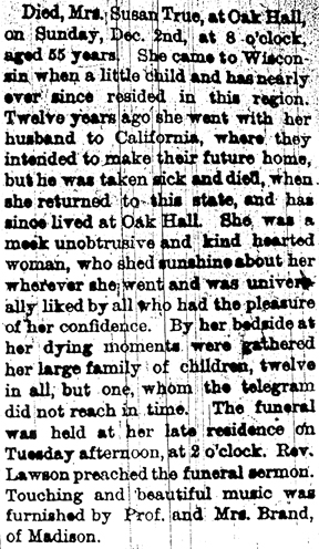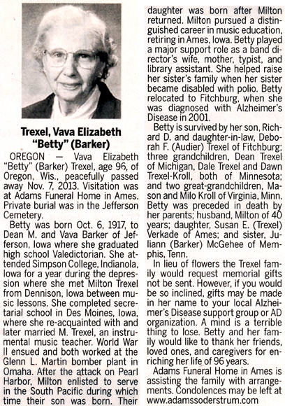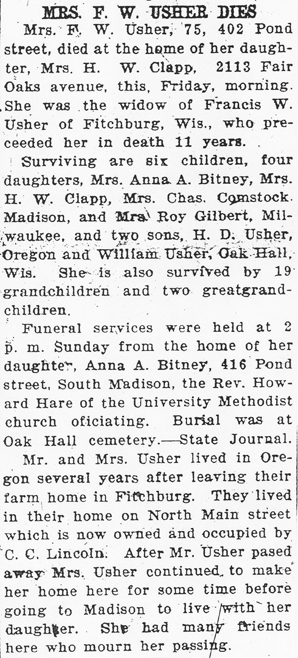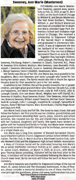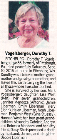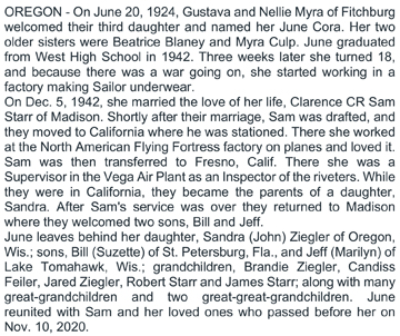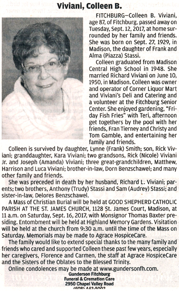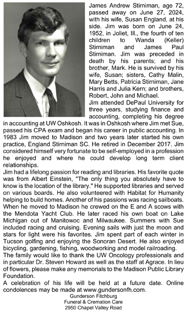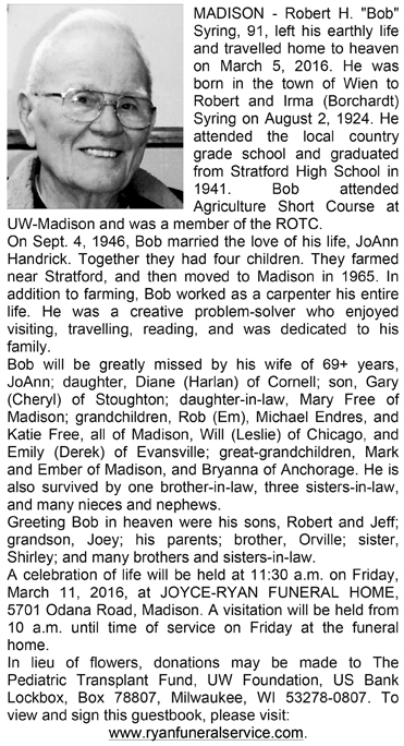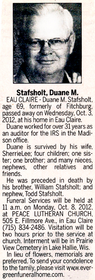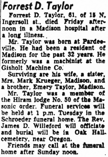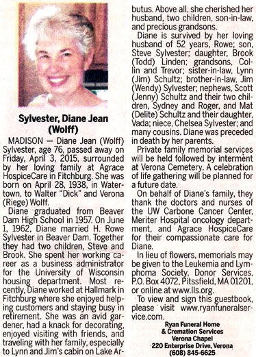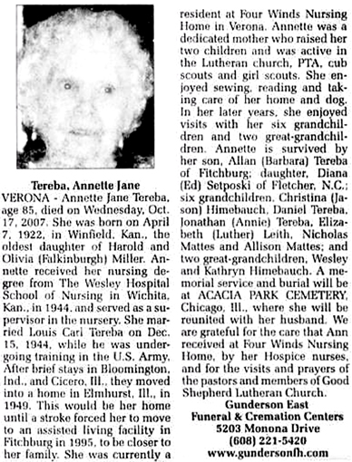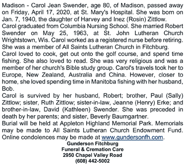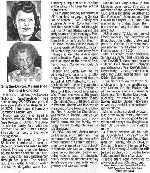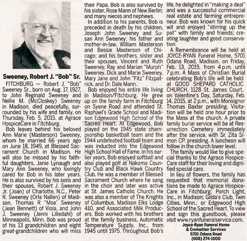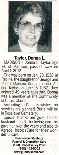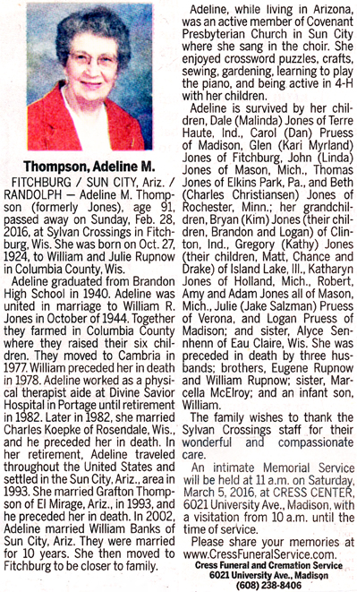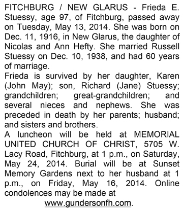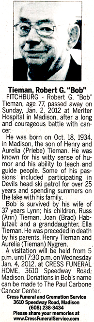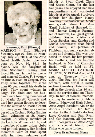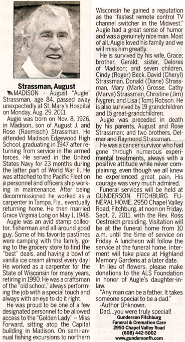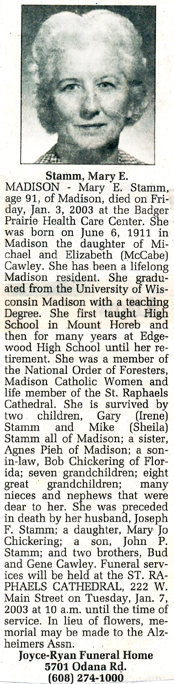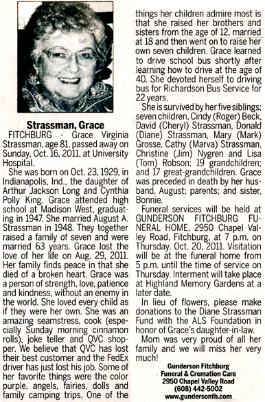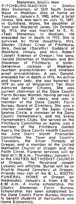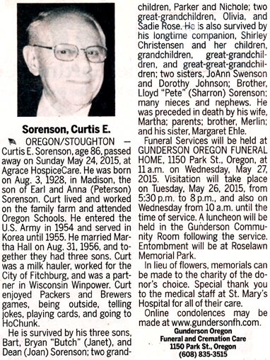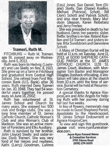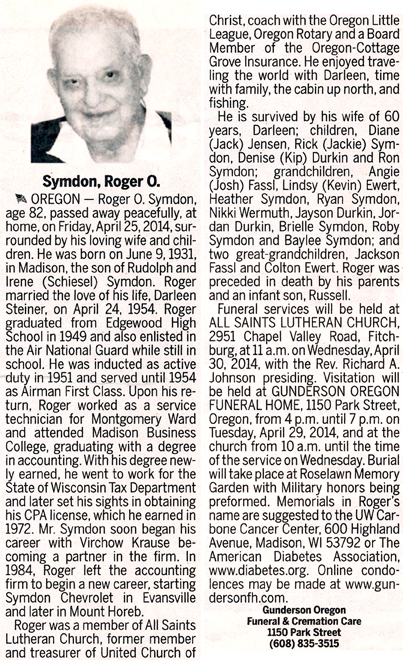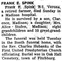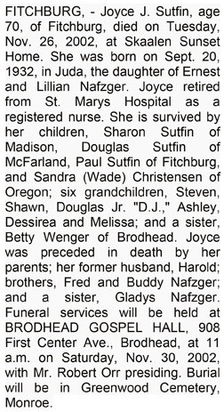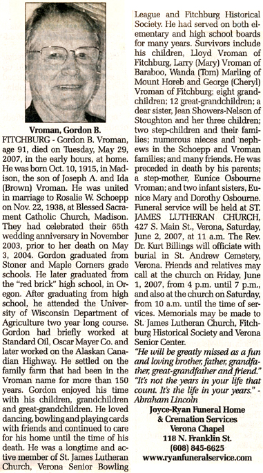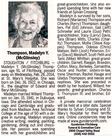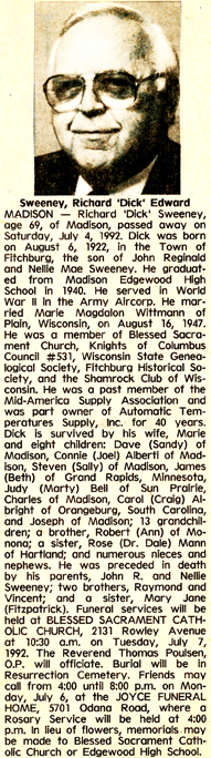 The list below contains names of people associated with Fitchburg, Wisconsin whose last names begin with S through Z for which we have obituaries. After each name there may be Obit and/or Cemetery in blue type. Click on these links to see the obituary image and cemetery information. Use the back arrow on your browser to return to this webpage. Some obituaries have been reformatted to provide better readability. If you would like to see a hard copy of an obituary please contact us so we can make appropriate arrangements to show you or send you a copy of the obituary. A list of all the names associated with an obituary can be searched in our FHS Obituary Database.