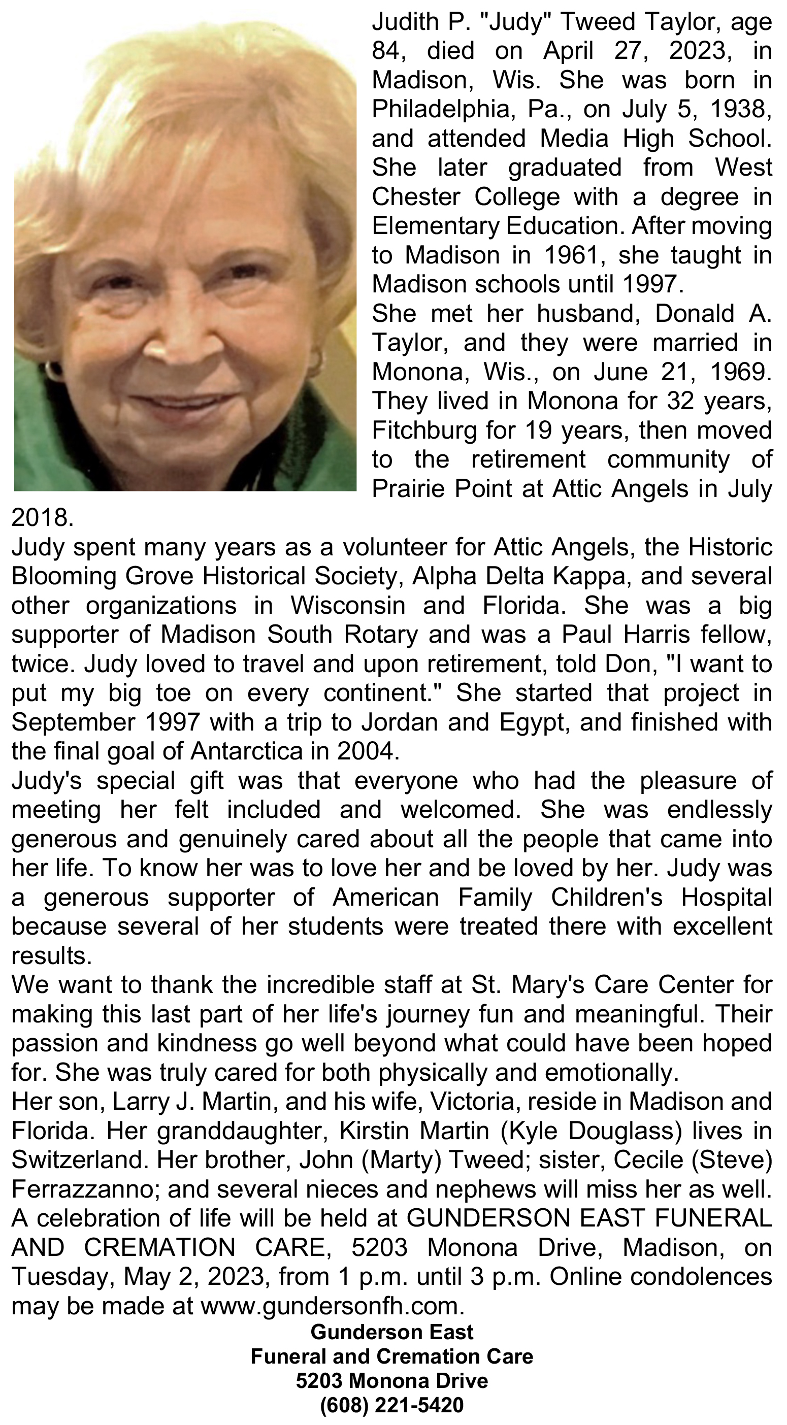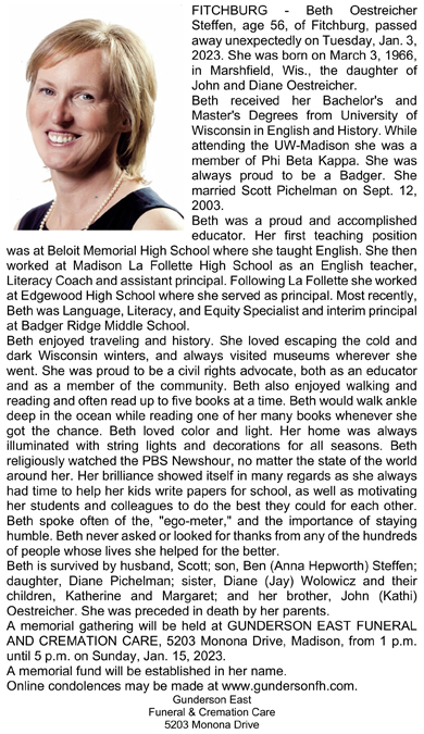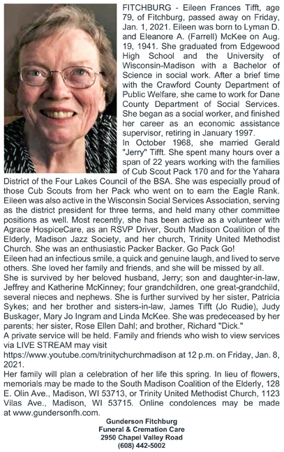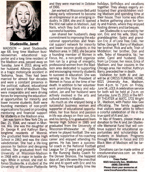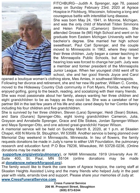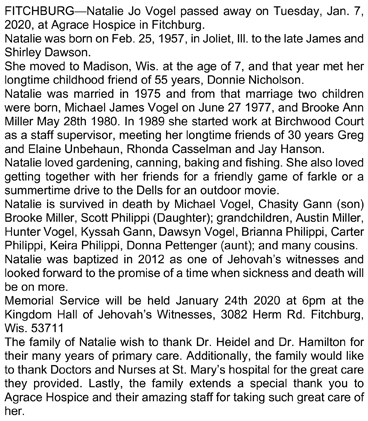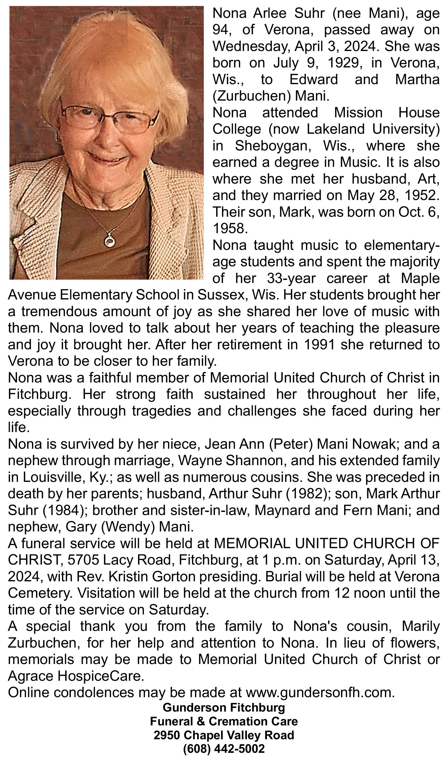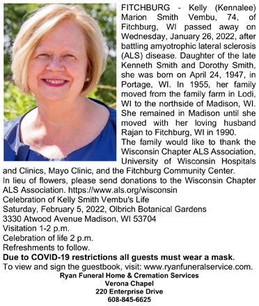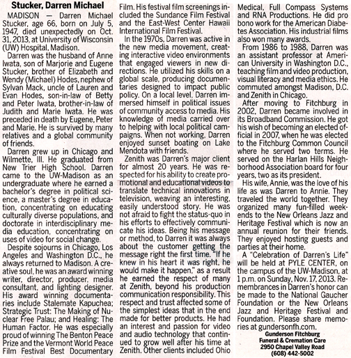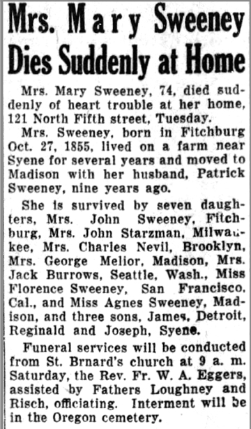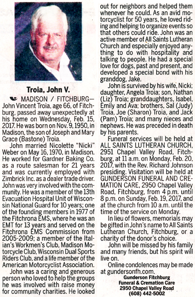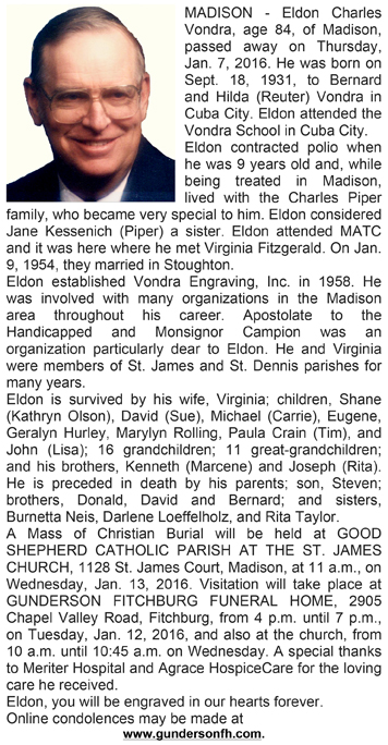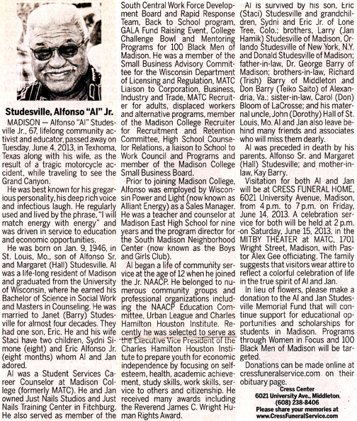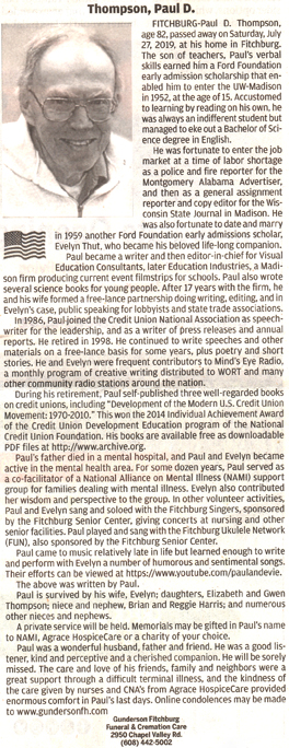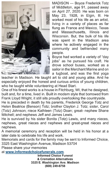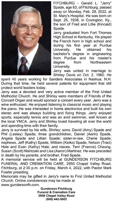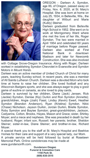 The list below contains names of people associated with Fitchburg, Wisconsin whose last names begin with S through Z for which we have obituaries. After each name there may be Obit and/or Cemetery in blue type. Click on these links to see the obituary image and cemetery information. Use the back arrow on your browser to return to this webpage. Some obituaries have been reformatted to provide better readability. If you would like to see a hard copy of an obituary please contact us so we can make appropriate arrangements to show you or send you a copy of the obituary. A list of all the names associated with an obituary can be searched in our FHS Obituary Database.
