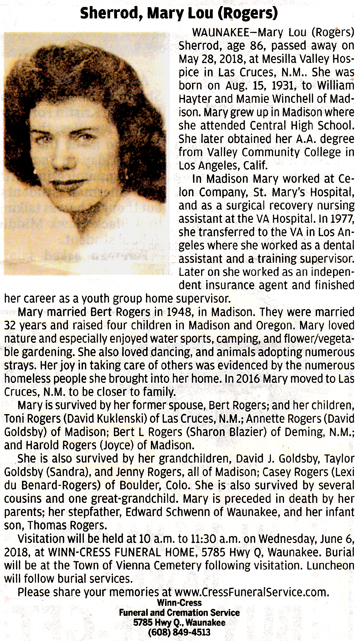 Sherrod, Mary Lou (nee Rogers) Obit Cemetery