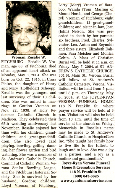 Vroman, Rosalie W. (nee Schoepp) Obit Cemetery