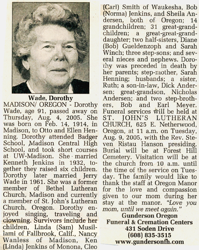 Wade, Dorothy Jenkins (nee Henning) Obit Cemetery