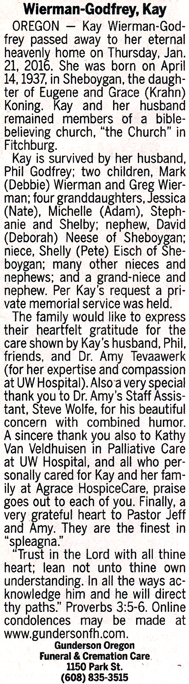 Wierman-Godfrey, Kay (nee Koning) Obit