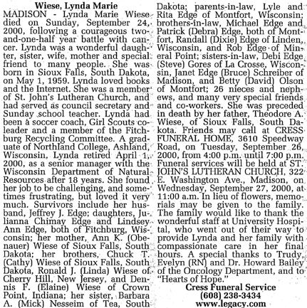 Wiese, Lynda Marie Obit Cemetery
