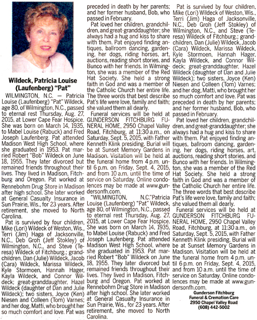 Wildeck, Patricia Louise “Pat” (nee Laufenberg) Obit Cemetery