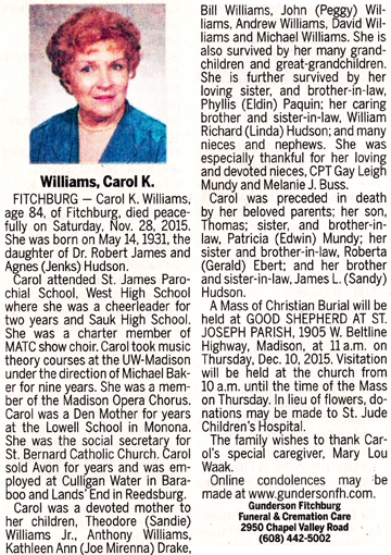 Williams, Carol K. (nee Hudson) Obit Cemetery