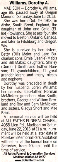 Williams, Dorothy A. (nee Rowlands) Obit Cemetery