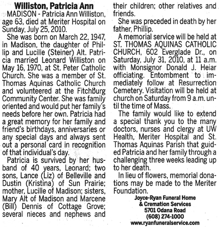 Williston, Patricia Ann (nee Alt) Obit Cemetery