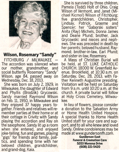 Wilson, Rosemary “Sandy” (nee Grycowski) Obit Cemetery