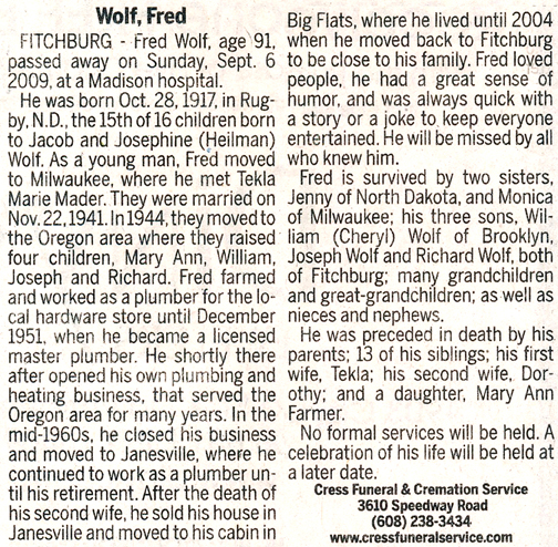 Wolf, Fred Leo Obit Cemetery