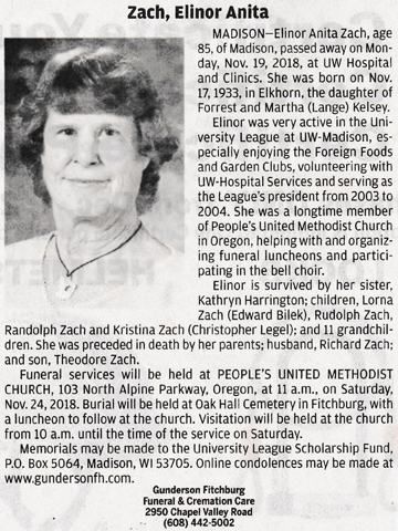 Zach, Elinor Anita (nee Kelsey) Obit Cemetery