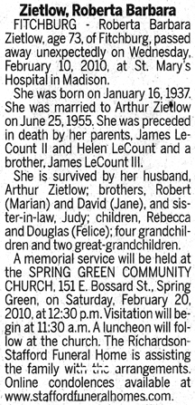 Zietlow, Roberta Barbara (nee LeCount) Obit Cemetery