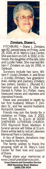 Zimdars, Diane L. (nee Felker) Obit Cemetery