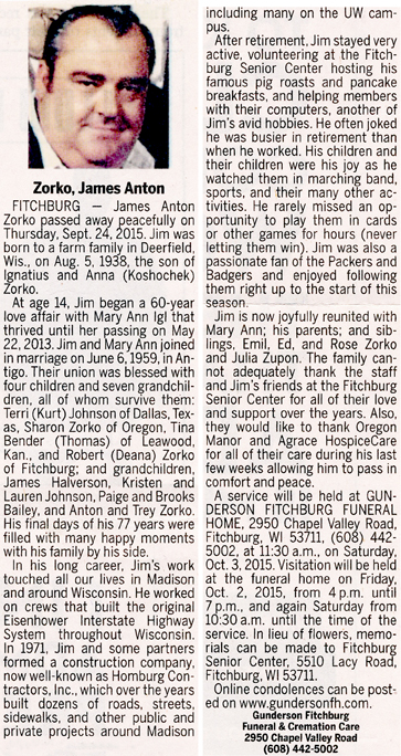 Zorko, James Anton Obit