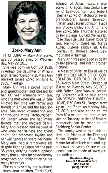 Zorko, Mary Ann (nee Igl) Obit