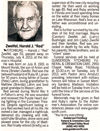 Zweifel, Harold J. “Red” Obit Cemetery