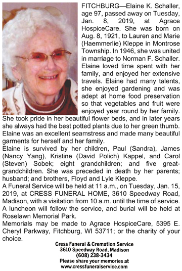 Schaller, Elaine K. (nee Kleppe) Obit Cemetery