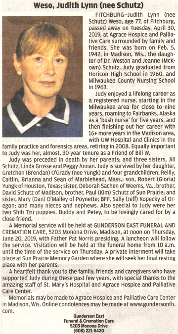 Weso, Judith Lynn (nee Schutz) Obit Cemetery