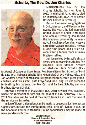 Schultz, Jon Charles, Rev. Obit