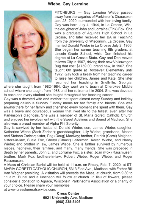 Wiebe, Gay Lorraine (nee Fox) Obit Cemetery
