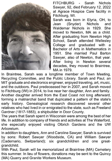 Sawyer, Sarah (nee Nichols) Obit