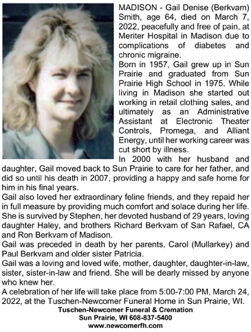Smith, Gail Denise (nee Berkvam) Obit Cemetery