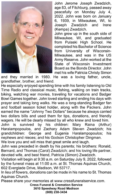 Zwadzich, John Jerome Joseph Obit Cemetery