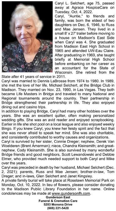 Selchert, Caryl L. (nee Jensen) Obit Cemetery