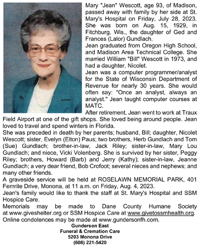 Wescott, Mary “Jean”, (nee Gundlach) Obit Cemetery