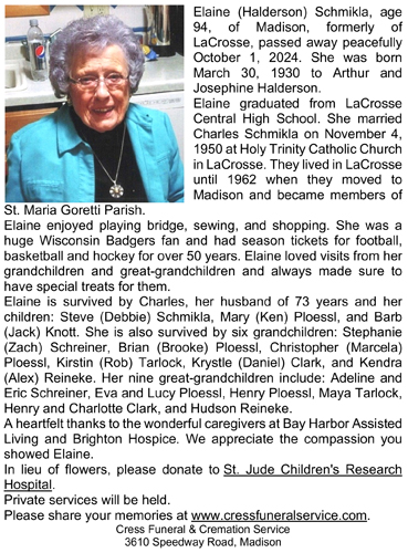 Schmikla, Elaine, (nee Halderson) Obit