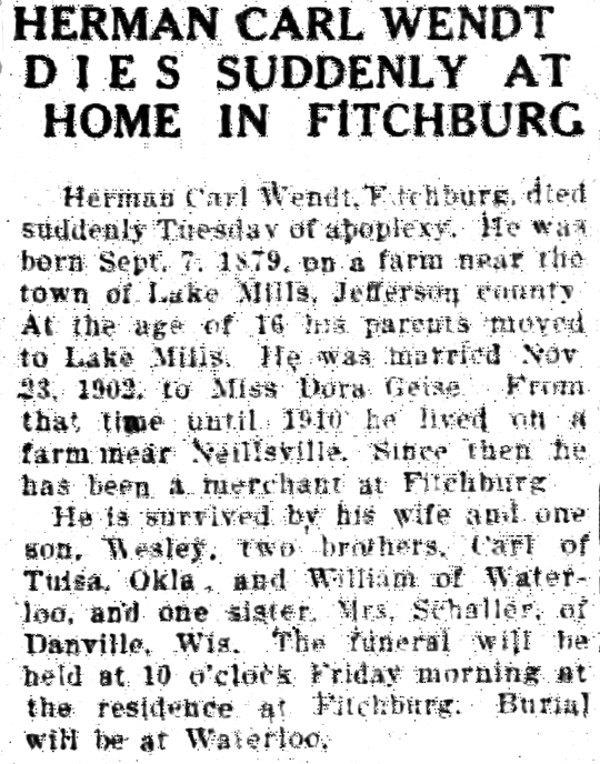 Herman Wendt bought the store in 1910 and he and his wife Dora ran the store until 1924 when Herman died. Mr. Wendt was buried in Oak Hill Cemetery, Waterloo, WI, the place where he lived before getting married in 1902. Mrs. Wendt continued to run the store and in 1926 added a small post office within the store when the nearby Lappley mill office, which contained the Fitchburg post office, burned down. In 1929, William Dehnert took over the store while Mrs. Wendt moved to Lake Mills to live with her son Wesley Wendt and his family. Mrs. Wendt returned to Fitchburg in 1932 to retake possession of the store when Mr. Dehnert could not make the payments due to the depression.